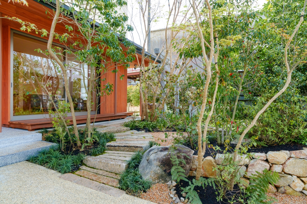 入口へのアプローチに繋ぐようにやさしい曲線をえがきながら仕上げております