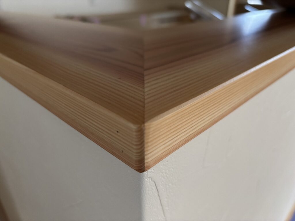 角の処理ひとつで空間の印象は変わります。柔らかな面取りで、無垢材の温かみが強調され安心感のある優しい表情になります。角のラインがピシッと通っているか、カウンターの角が隣り合う建具の枠ときれいに揃っているか、こうした小さな線の重なりが整うことで空間全体に心地よさが生まれます。