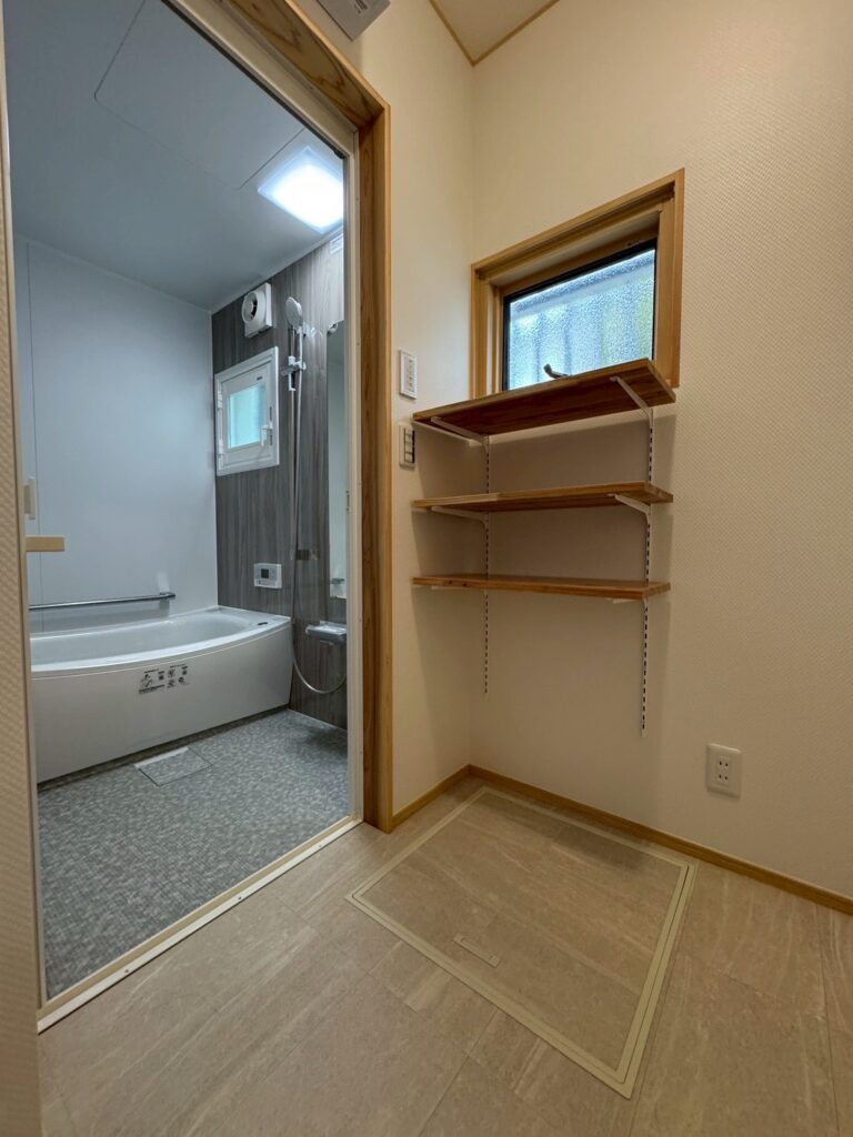 また、脱衣所の床は冷たさを感じやすいタイルからクッションフロアへ変更。足元が冷えにくくなり、快適にお使いいただけます。明るさを保ちながら収納も設け、毎日使いやすく、片付けやすい脱衣所に仕上がりました。