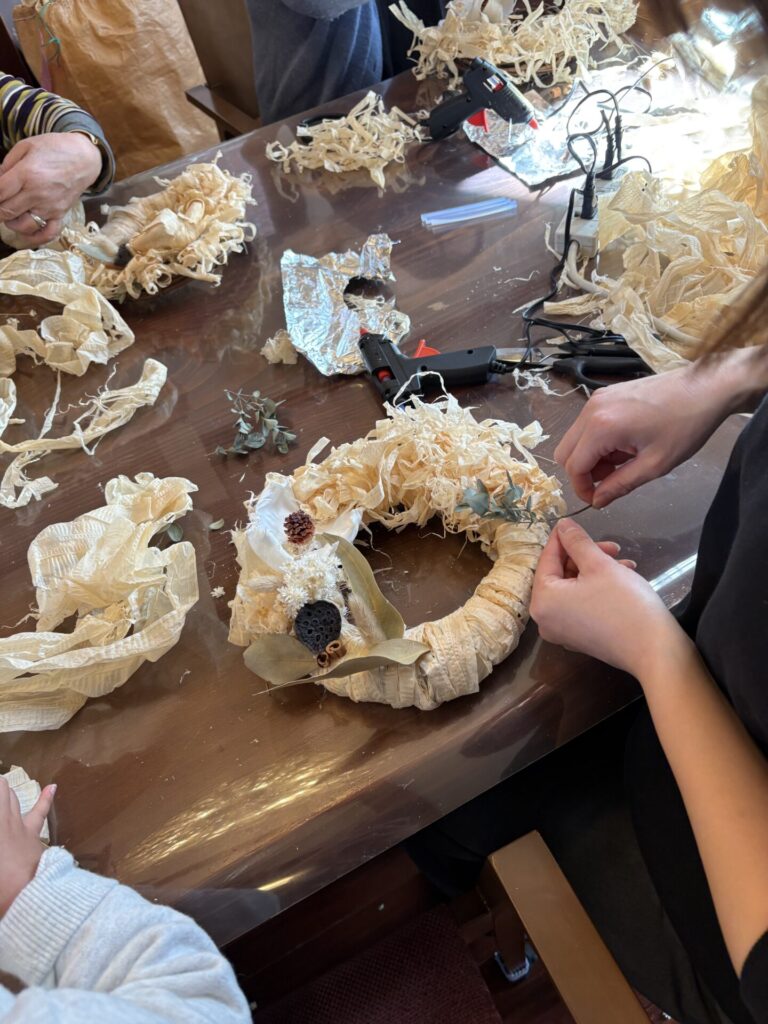 木の香りがするリースづくりを楽しんで頂きました。皆様どんな風に作ろうか親子やお友達、おばあちゃんとお孫さん同士で相談しながら素敵に仕上げましたね。