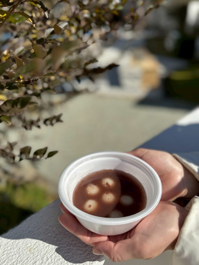 お餅とおしるこは冷えた体に沁みましたね。身体を寄せ合って食べました