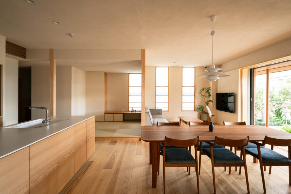 窓の配置や天井の高さ、視線の抜けを工夫し、光と風、庭とのつながり を大切にしたデザイン。