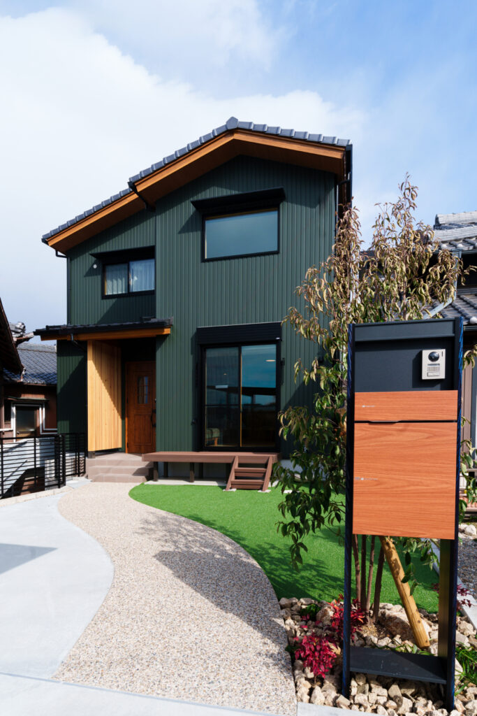 スタイリッシュなガルバリウムと、木の風合いがアクセントになった外観。