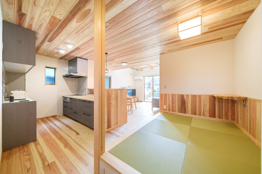 畳コーナーでは、お昼寝や遊びを楽しむ子どもの姿をキッチンから見守ることができます。