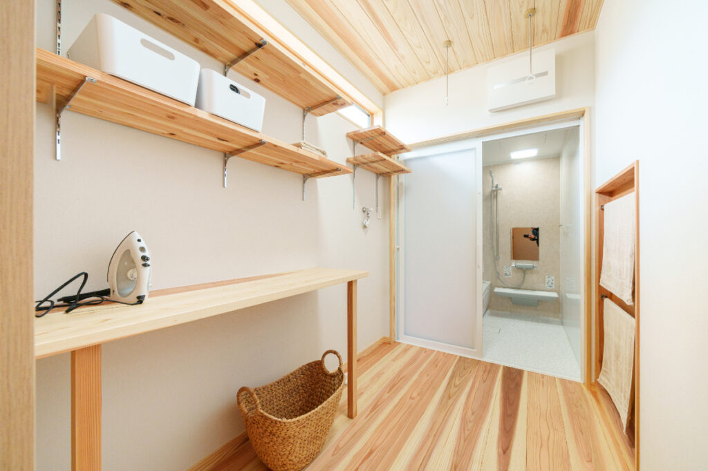 バスタオルを干せるパイプや、たっぷり収納できる可動棚を設け、家事がしやすい工夫を取り入れています。