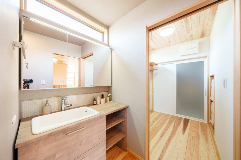 独立した洗面台を設けることで、家族みんなが気兼ねなく使える空間に。