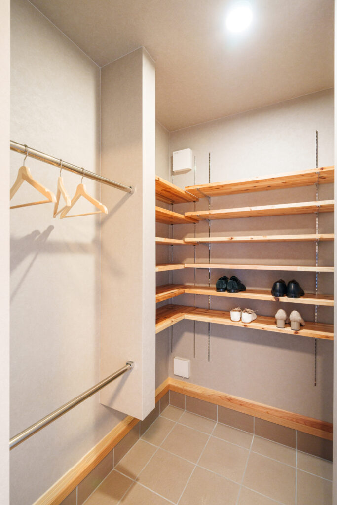 家族分の靴や傘、雨合羽まで片付く玄関収納。