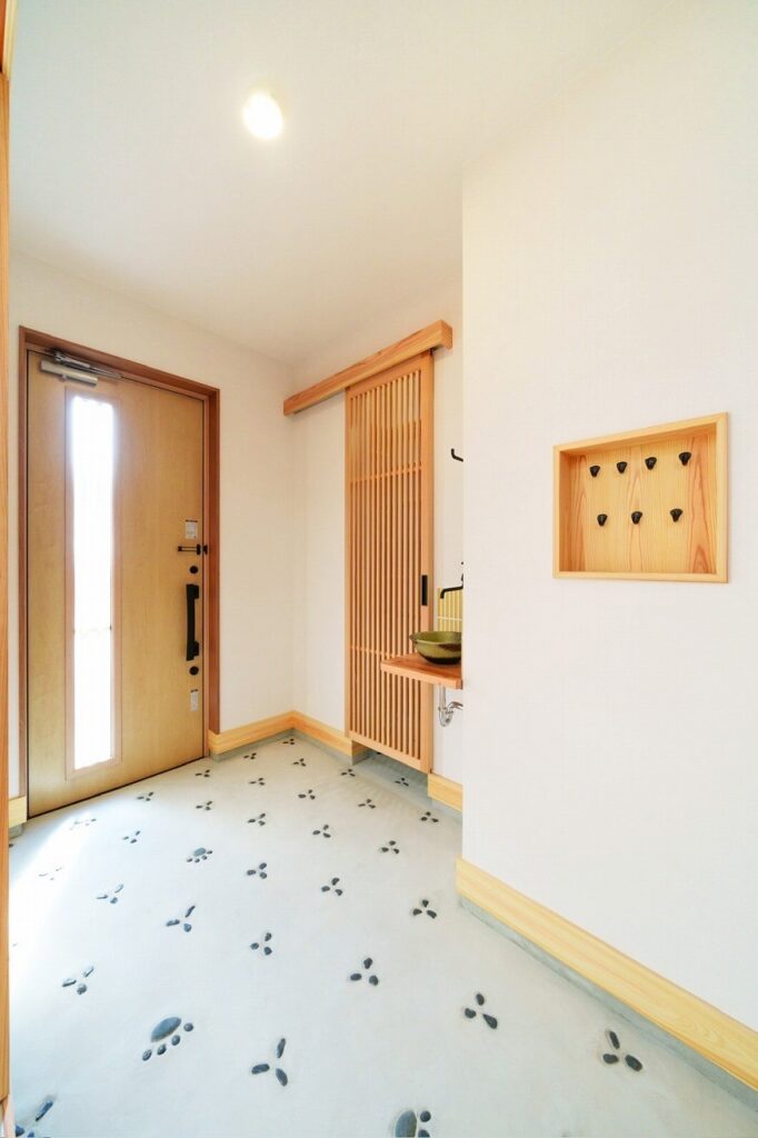 遊び心を添えた、モダンな佇まいの玄関。