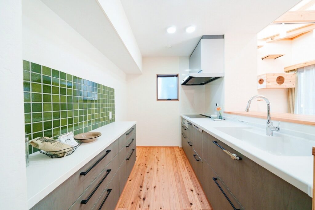 爽やかで品のあるグリーンのタイルが彩るキッチン。