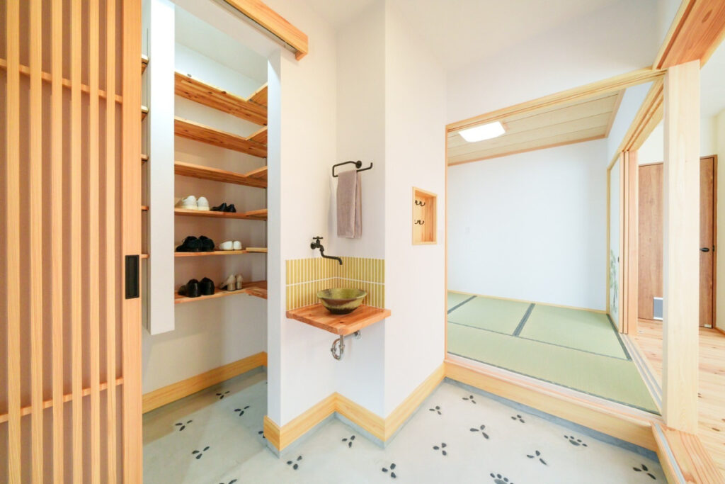 キーボックスや建具、手洗いボウルなど、細部までオリジナルのこだわりが感じられます。