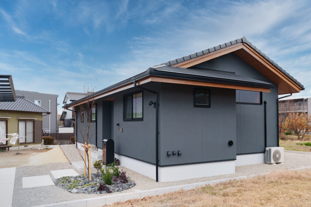 落ち着いた色合いと木の風合いが調和する、平屋の外観。
