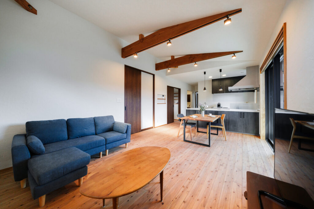 梁をあえて見せることで、大胆さと自然素材の魅力を感じられる空間になっています。