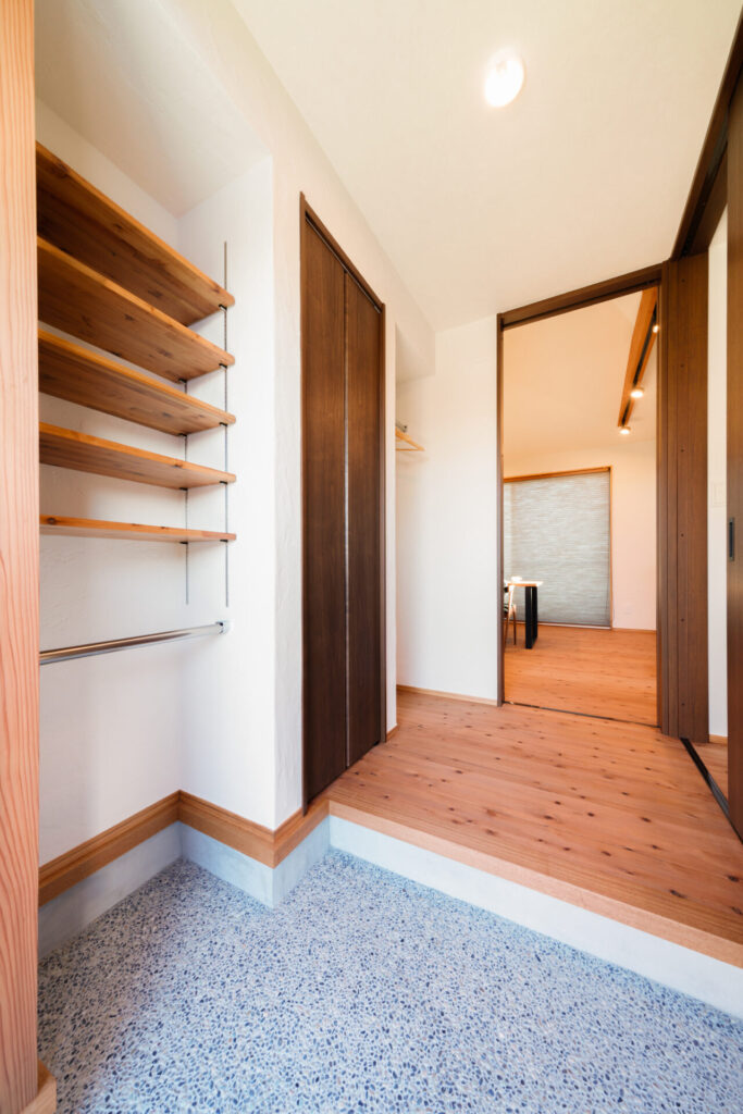 傘なども収納できるよう工夫し、すっきりとした空間を保てる玄関。